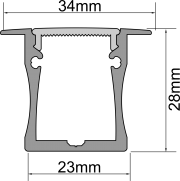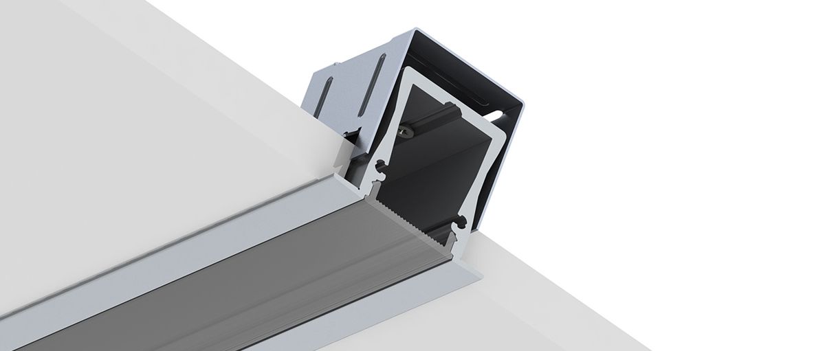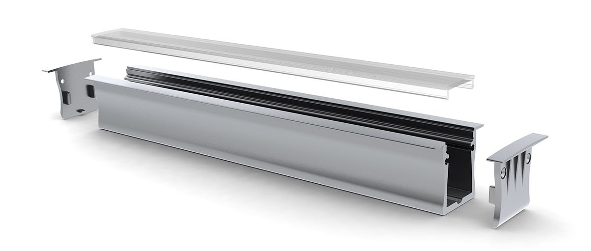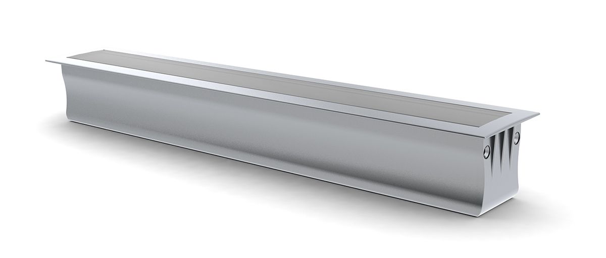 A recess-mounted anodised aluminium linear LED profile, available with a transparent cover, and frosted or opal polycarbonate diffusers.