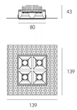 Trimless downlight for plasterboard, square shape equipped with high-power LEDs, plastic lens to meet control and luminance requirements in environments with VDTs.