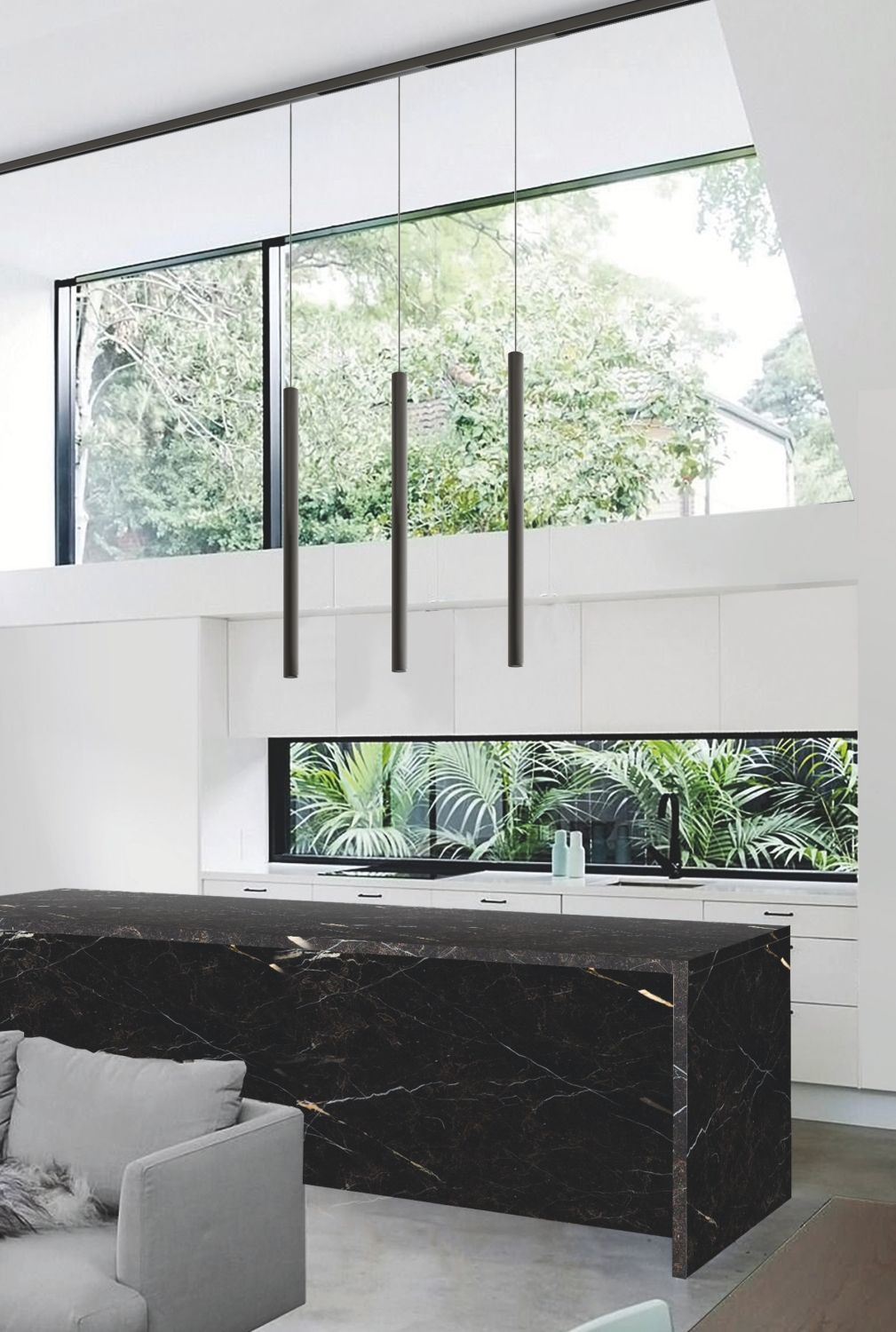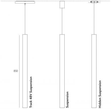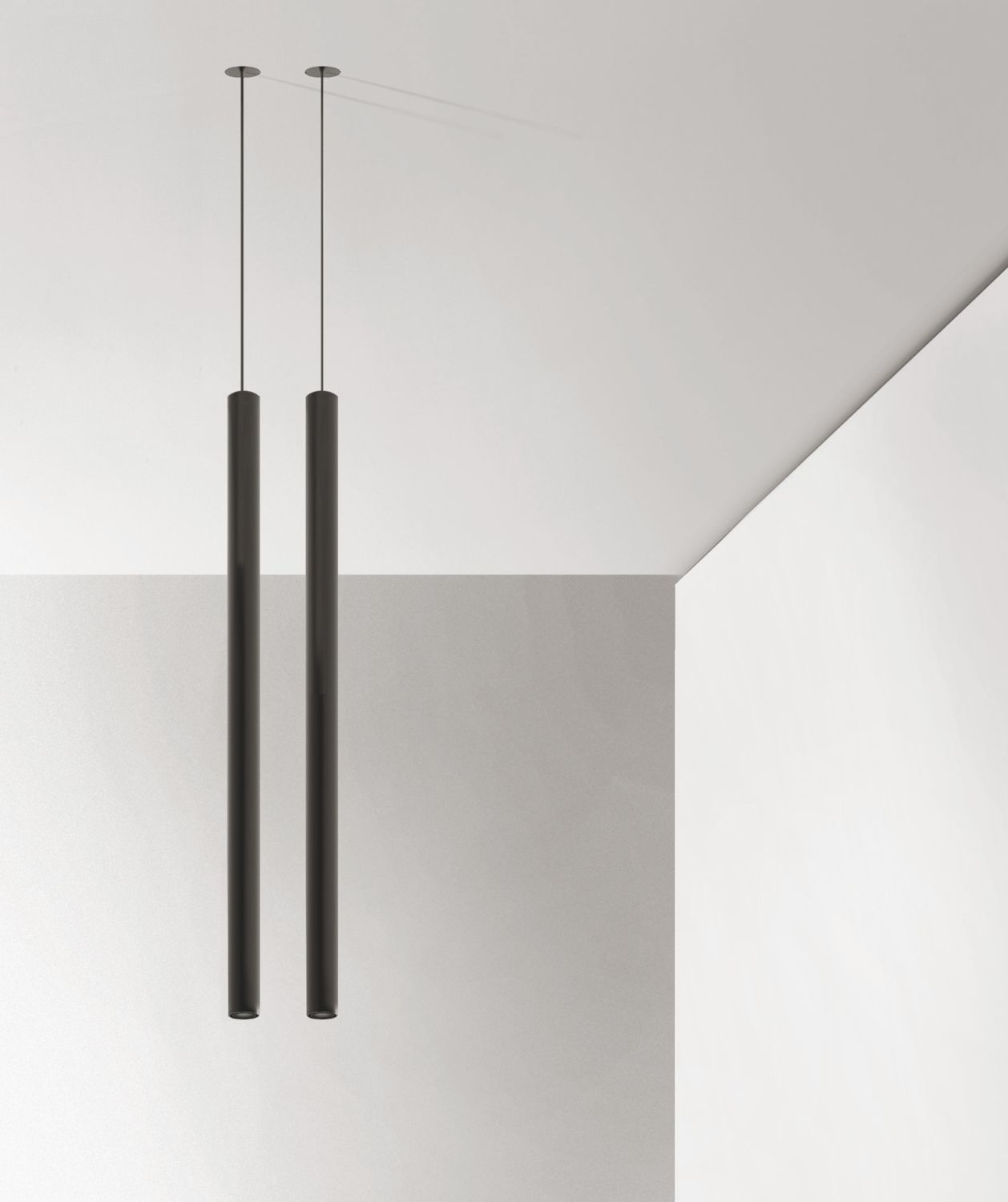 Perfect proportions for a cylindrical suspension element characterized by a double skin, one external and one internal to reduce luminance. LED suspension lamp with ceiling base, recessed or with 48V adapter, L = 850mm.