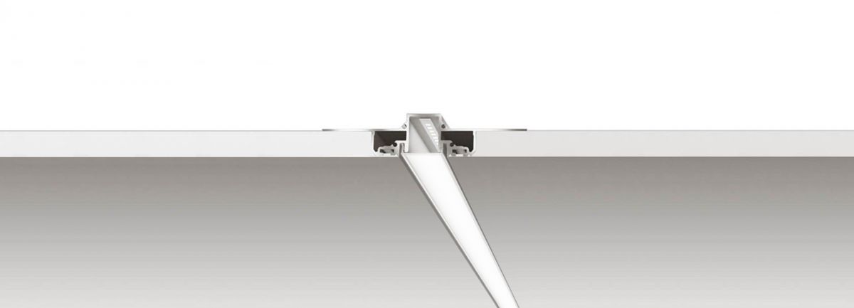 A trimless recess mounted linear LED luminaire manufactured from extruded aluminium and finished in matt white with an opal diffuser. Designed for installation in single layer 12.5mm Gypsum plasterboard.